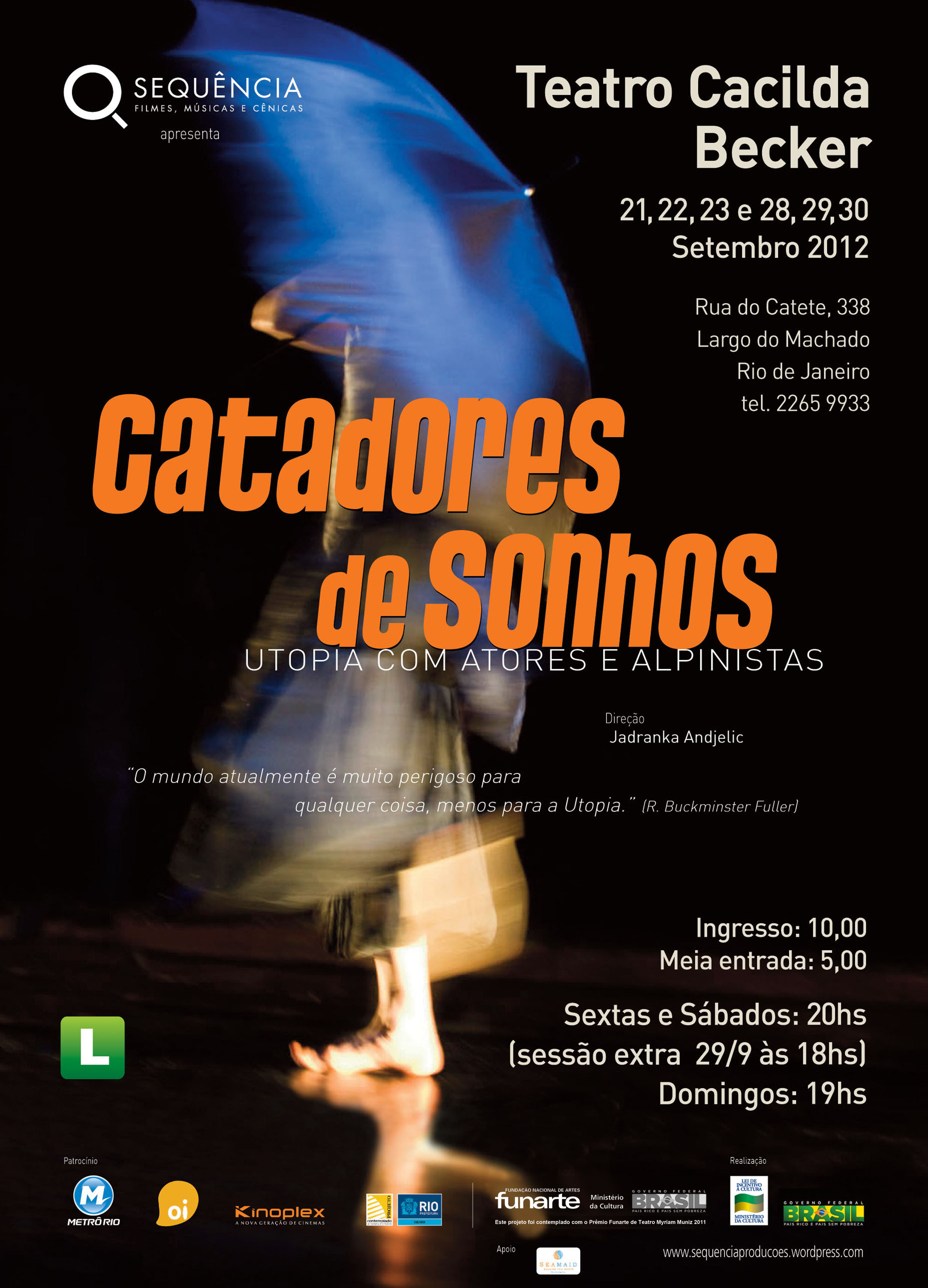 Produtora dos espetáculos de teatro: ESTRANHO 2019, MEMÓRIAS DO PEQUENO CIRCO em 2015, CATADORES DE SONHOS – Utopia com atores e alpinistas em 2011( Prêmio FUNARTE de Teatro Myriam Muniz 2010); CIDADE IN/VISÍVEL (Prêmio FUNARTE de Teatro Myriam Muniz 2009) no Metrô Rio 2010, com direção de Jadranka Andjelic.
